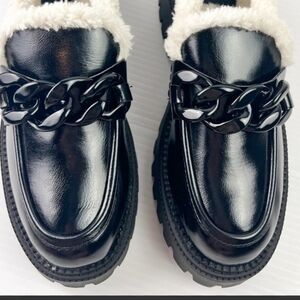 Stylish black loafers featuring a bold chain detail. Cozy white lining for added comfort. Perfect for any occasion.