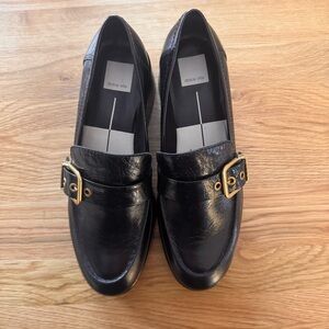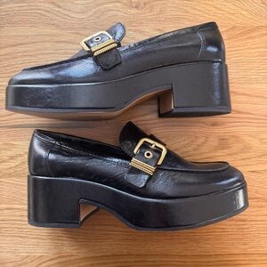 Sleek black loafers with a bold gold buckle. Chunky platform for added style. Perfect for any occasion.