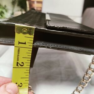 This sophisticated black clutch from Dolce Vita features a luxurious quilted design and a sleek metallic chain strap. Its glossy finish and elegant rectangular shape make it a versatile accessory for both casual and formal occasions.