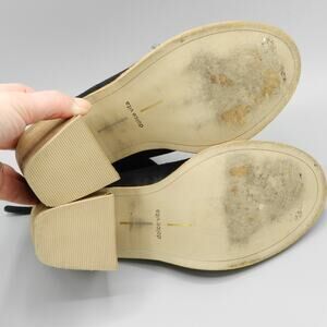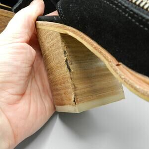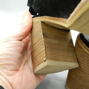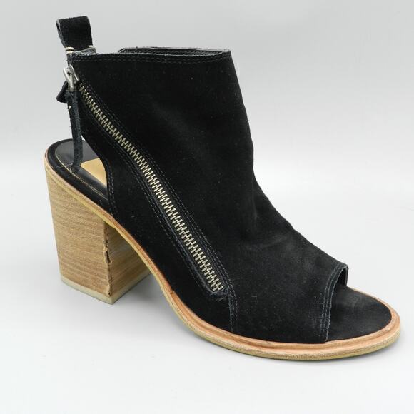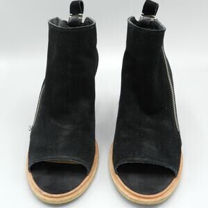 Black suede leather sling back ankle booties with an open toe, side zip closure, and stack heel. Scrape marks to inside edges of heels, shown in photos, no other flaws that I can find.