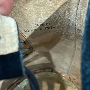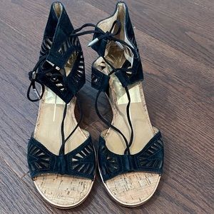 Stylish black wedges with lace-up design. Cork sole adds a natural touch. Perfect for casual outings.