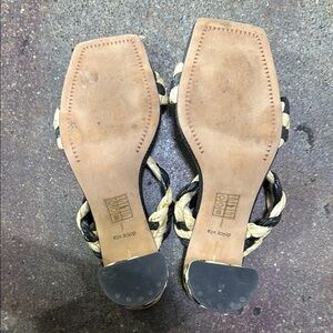 Experience the perfect blend of style and comfort with these Dolce Vita mules. Featuring a striking black and cream braided strap design, these shoes offer a modern square-toe silhouette. The architectural elegance of the woven straps makes them a standout addition to any wardrobe. Approx 4 inch heel