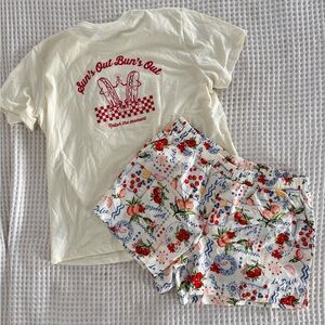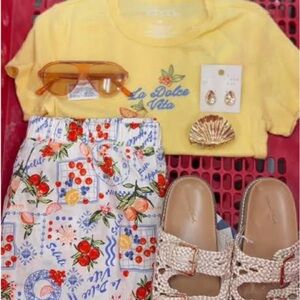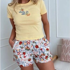 - Details: Elastic waistband, vibrant print with floral and fruit patterns