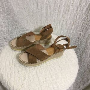 Dark Tan Suede crossed straps wedge sandals. Pre-owned in good condition. Please refer to pictures for best description and condition verification. Size 8.