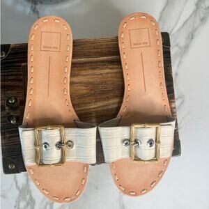 These NWOB Dolce Vita Dasa Sandals feature an embossed leather upper with an adjustable oversized buckle, a round-toe silhouette, and a slip-on design.