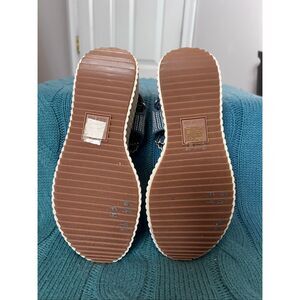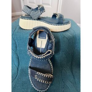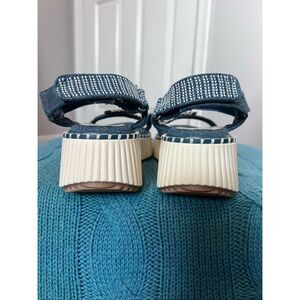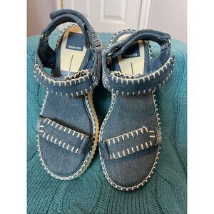 Super cute and stylish blue denim color w/contrasting stitching adds cool contrast to a strappy look in the sporty chunky flat form heels.