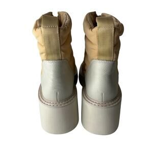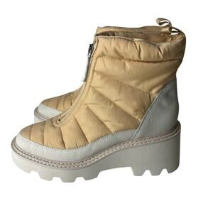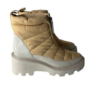Dolce Vita Helki Bootie in Honey. Size 9. Features round toe, leather and fabric upper, mixed-media design, platform rubber sole, and front zipper closure. Excellent pre-owned condition.