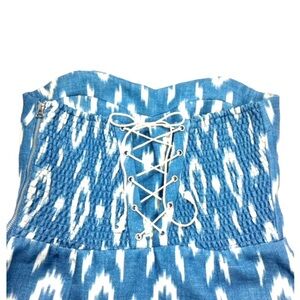Dolce Vita Ikat Print Strapless Lace up Back Mini Dress in Mid Indigo Blue