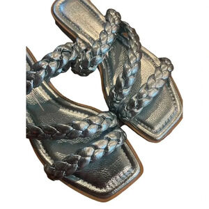 The Dolce Vita Iman sandals are a stylish choice for women, featuring a blue color and a slide style with a braided strap and square toe. Size 7.5. Made from manmade materials, these sandals are perfect for casual summer occasions. They are pre-owned but in excellent used condition, barely worn.
