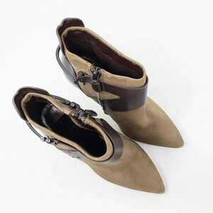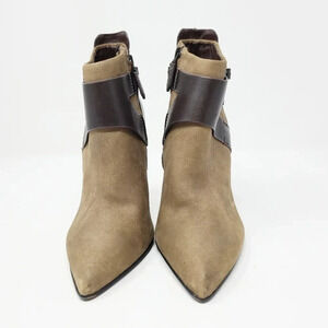 Dolce Vita Isleen Heeled leather boots in Desert Nubuck. Metal and leather harness strap detail with spike. Pointed toe. Side zip closure. Stiletto style heel.