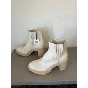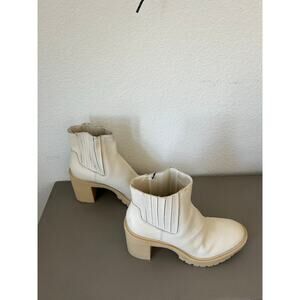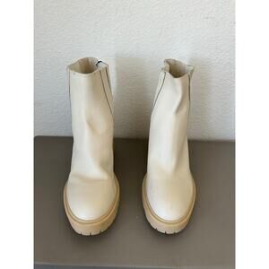 These classic boots are perfect for seasonal transitions. They are the Caster H20 boot which are a 70s-inspires design. They are a chelsea boot style with leather uppers that come in a chic ivory color. The water-repellant rubber lug sole makes them perfect for the weather. They are a pull-on style with elastic gore panels and a rounded toe. These are new without the box, they are overstock liquidation so please review photos as there are a couple of blemishes.