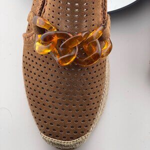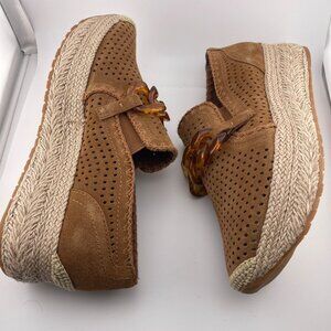Step into effortless chic with these Dolce Vita Jhenee slip-on sneakers. Featuring perforated pecan suede uppers, a bold tortoise resin chain detail, and a platform espadrille-inspired sole, these sneakers strike the perfect balance of modern style and comfort. Ideal for casual outings, travel, or adding a statement to everyday fits.