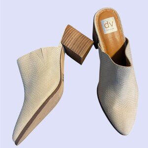 DOLCE VITA Tendle Block Heel Mule in Nude Tan Suede. Featuring a stacked leather block heel, this contemporary mule is great for the office or post-work socializing. It is pre-owned but in excellent like-new condition.