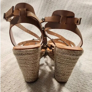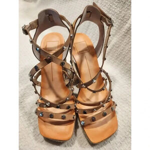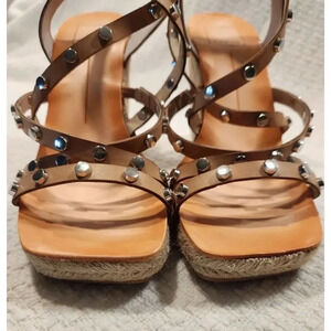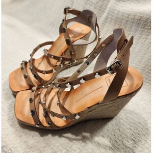 Uplift your sophisticated street style wearing the Dolce Vita Marika Heels. Stud-embellished synthetic upper. Synthetic lining. Comfort synthetic footbed. Adjustable buckle strap closure on the ankle. Square open toe. Jute-braided lofty wedge. Textile and synthetic outsole.
