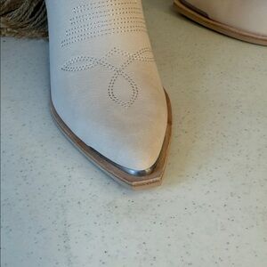 Step out in style with these chic floral embroidered western ankle boots. Featuring a cream and blue color palette, these boots are perfect for adding a touch of elegance to any outfit. Block heel.