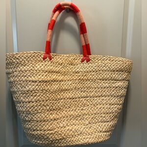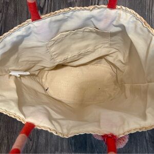 Chic straw tote with bold red handles and pom-poms. Perfect for casual outings. Internal pocket.