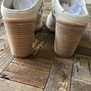 Elegant off-white mules with a stylish braided strap. Features a sturdy block heel.