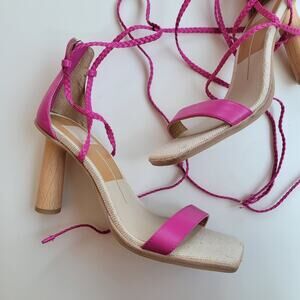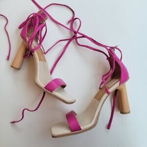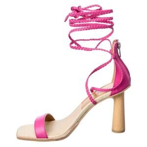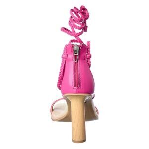 Quadra Sandal in magenta faux leather and canvas and silver-tone hardware with straw lace-up detailing and wooden heel