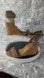 Size 9. Suede upper with silver studs. Man-made sole with cork pattern 4" heel. Shoe has a bit of a toned-down gladiator look.