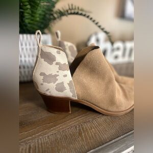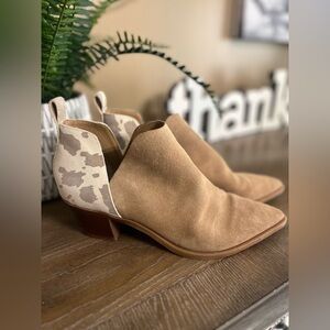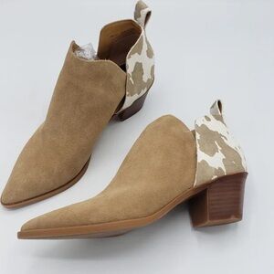 Dolce Vita Satara Stack Ankle Bootie features a scallop design at the sides, a trendy cowboy fashion heel and a pointed toe for a chic and sophisticated look to any outfit. Desert Multi Suede. Size 8. True to size.