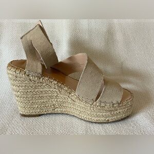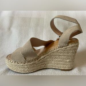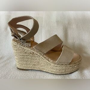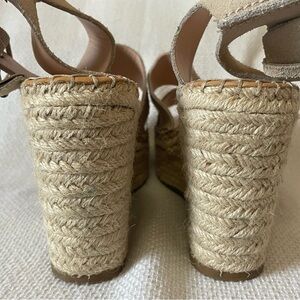Tan suede uppers. Buckle wraps around ankle and is adjustable. Rope covered platform for espadrille look. Uppers are in EUC condition. Soles show some use but lots of love and wear left to give.