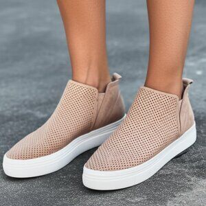 Elevate your casual style with these chic Dolce Vita perforated platform slip-ons. This versatile Nude Tan Suede sneaker-bootie hybrid gives you the comfort of a sneaker with a trendy lift. They're perfect for the Retro Revival trend or adding a luxurious touch to your everyday uniform.