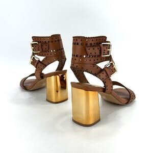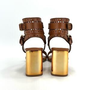 Dolce Vita Straps Sandal Sz 9.5 Brown Leather Gold Block High Heel Laser-Cut New