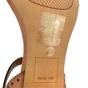 🐠 Dolce Vita Straps Sandal Size 9.5 Brown Leather Gold Block High Heel Laser-Cut New.