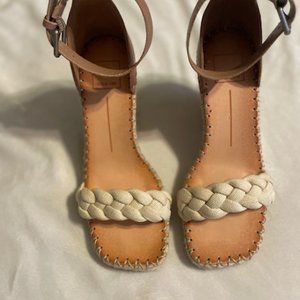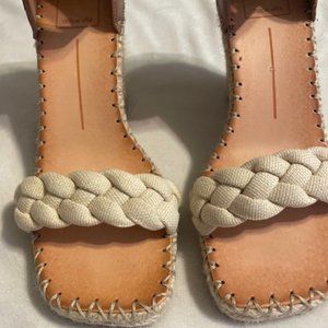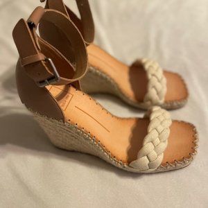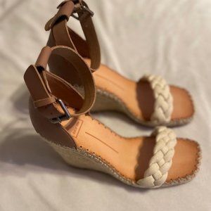Stylish wedge sandals with braided cream straps. Brown ankle strap for secure fit. Perfect for casual outings.