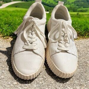 Step into style with Dolce Vita's white athletic shoes, featuring a distinctive textured sole that adds a modern touch. Crafted from a leather-like material, these sneakers offer a minimalist design with a comfortable lace-up closure. Perfect for both casual and athletic wear, they provide added ankle cushioning for enhanced support.