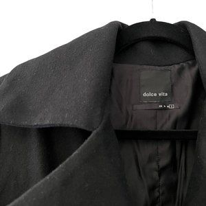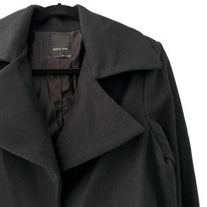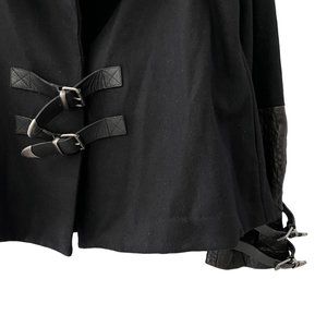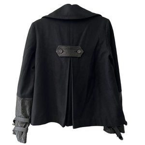 Other: Collared; long sleeves; front magnet and buckle closure; pockets on either side; classic fit; straight hem; lined