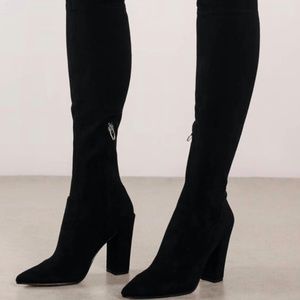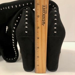 Brand new, never worn bc not my size. Excellent condition. Comes with dust bag. Studded back seam with all studs attached. Faux, stretch suede gently hugs to prevent slipping. Also has an elastic band at thigh. Boot shaft approx 28"/71.1cm measured from front of arch. Working side zipper closures for easy on and off. No trades. Reasonable offers will be considered.