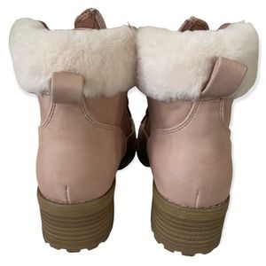 I have brand new Dolce Vita children's boots, the color is light rose/pink color. These boots are size 3. The material is suede. The heel size is about 1 1/2 inches. There is a tiny mark on sole next to the zippers. These boots are perfect pair for the winter !! Please let me know if you have any more questions.