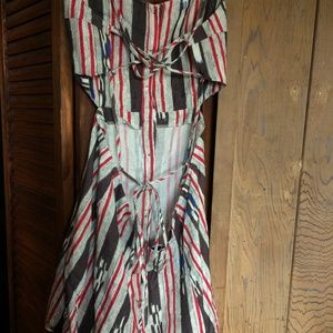 Sleeveless patterned dress, just above knee length, open on sides and back with spaghetti strap ties in back