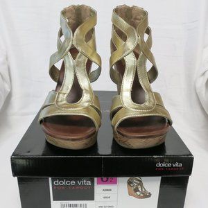 Gently worn pair of wedges - Dolce Vita for Target - Gold cork wedges size 8.5. Runs about a half size large (I'm a size 9, this fit well). Approx 1 inch platform at the front of the shoe, and 4 inch heel. Zips up behind the heel. Very comfortable--could wear all day, and I avoid wearing heels because they hurt haha! Includes original box.