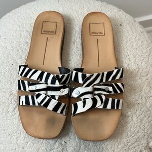 Embrace a bold look with Dolce Vita's black and white zebra print sandals, perfect for casual summer outings. These real fur dyed cowhide slide-style sandals feature a wide band across the foot and a comfortable flat sole, making them both stylish and practical. The minimalist design is elevated by the striking animal-inspired pattern, ensuring you stand out in any crowd. They are in great condition! Have barely been worn.