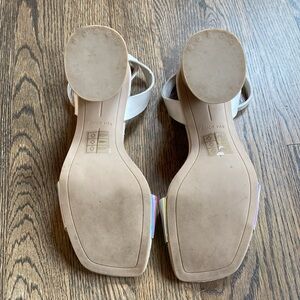 Dolce Vita white and iridescent chunky heeled sandals. 2.75” heel height. Color goes with everything. Good used condition. Strap slightly separated at buckle. Size 6