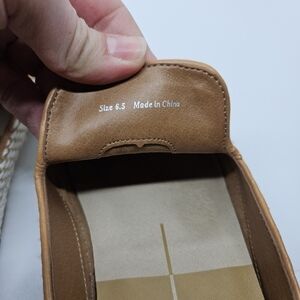 Almond toe mules with tan and white woven uppers. In very good used condition.