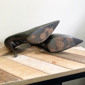 Dark greenish black color heels in good condition with minor wear to the lower part of the heels as shown. Heel height is 4”
