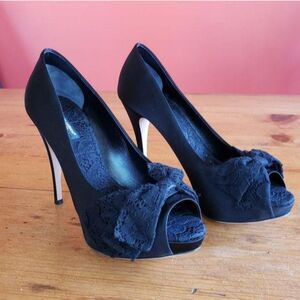 Dolce and Gabbana Satin Lace Bow Pump Black Platform Heels Peep Toe Size 39