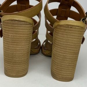 Tan chunky heel sandals by Dolce Mojo Moxy women's size 9M. Experience the style and edgy look of this ankle-strap sandal complete with two adjustable buckles for ultimate comfort. The 4.5 inch stacked heel adds the finishing touch.