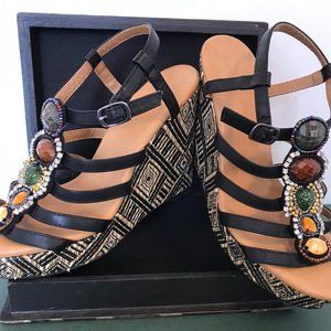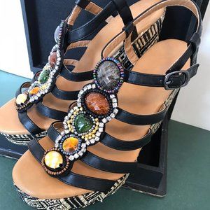 Dolce wedge platform "Corona" sling back with straps across foot with large stones on each strap. 4-1/2" back heel wedge, 1" platform at toe and adjustable buckle on ankle strap. Geometric weave black & cream on wedge and platform. New never worn.