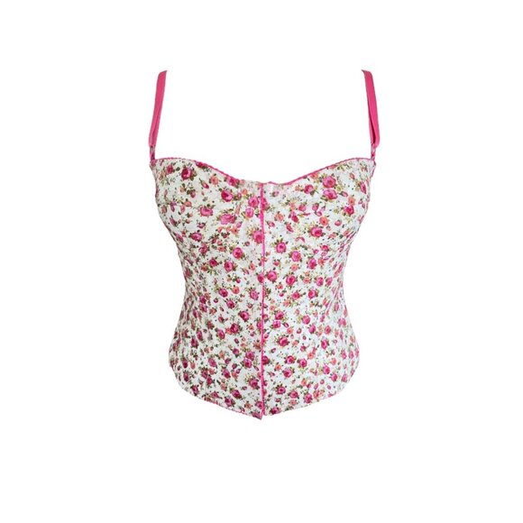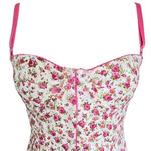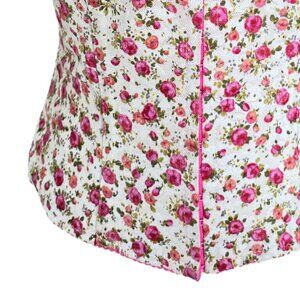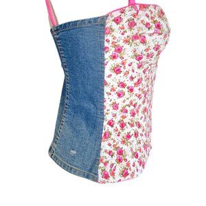 Corset top by D&G Dolce & Gabbana in a pink and white floral cotton bodice with a denim stretchy back. Hook and eye closure down front. Adjustable shoulder straps.
