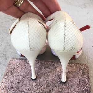 These are fabric n faux snakeskin trim and back. Double strap around the ankle. Please look at the pictures of the shoes. Need to be cleaned up all around. Heel height is 3.5 inches