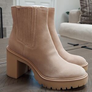 Dolce Vita Caster H2O Dune Suede Boots NWT block heel, lug sole clog style sole 70s style silhouette waterproof - protects against rain, puddles and slush 3.5” heel, 0.75” platform leather upper pull on style with elastic insets