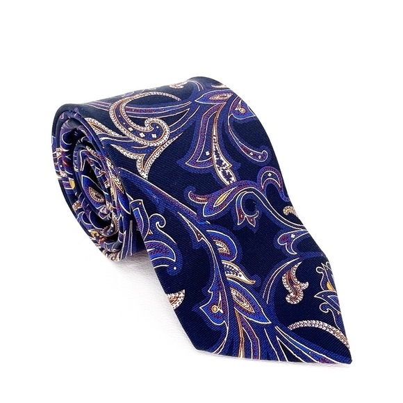 Dolcepunta Men’s 100% Silk Necktie Paisley Navy Yellow Red Made in Italy Tie EUC