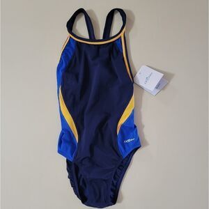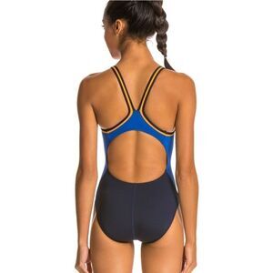 Stay confident and comfortable while wearing the Reliance color block DBX-back one piece in navy with blue and gold accents on the sides and across the back. This chlorine-resistant suit provides comfort to perform with freedom of movement.