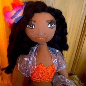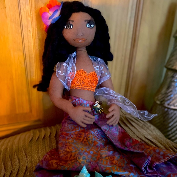 Another island princess,curly long hair,very tropical outfit with ribbon sandals. Handmade body and costume, hand painted face. Has been in Tupperware container since purchased. Thought maybe someone could enjoy her out of box. Open to trades. Thanks