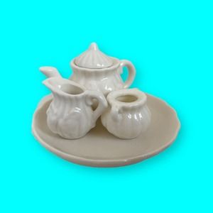 White ceramic Doll or Toy Tea Set with Raised Embossed Roses Design. Set includes 1 Tray, 1 Teapot with lid, 1 Sugar Bowl and 1 Creamer, for a total of 5 pieces. The sugar bowl does not have a lid. The teapot is 2 inches tall with the lid, and the tray measures 3 inches across.
