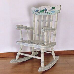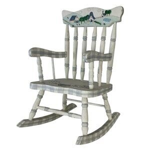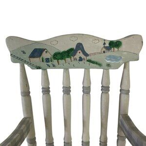 Charming Vintage Doll rocking chair Home Made Artisan with hand painted village scene. Features a delightful gingham plaid design in white and pale grey blue Multicolor 1980